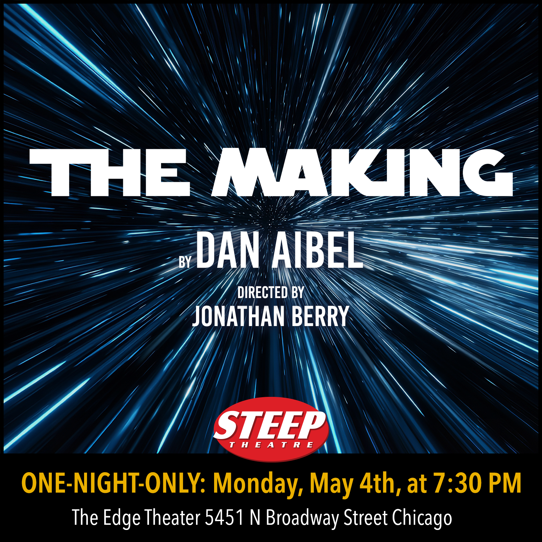 On Monday, May the 4th - the unofficial international holiday honoring Star Wars - Steep will present the first public staged reading of Dan Aibel’s The Making, a revisionist retelling of the story behind the film that became a cultural phenomenon. The reading will be directed by Steep company member Jonathan Berry and feature a cast of Steep ensemble members. One night only at the Edge Theater in the Edgewater neighborhood of Chicago.