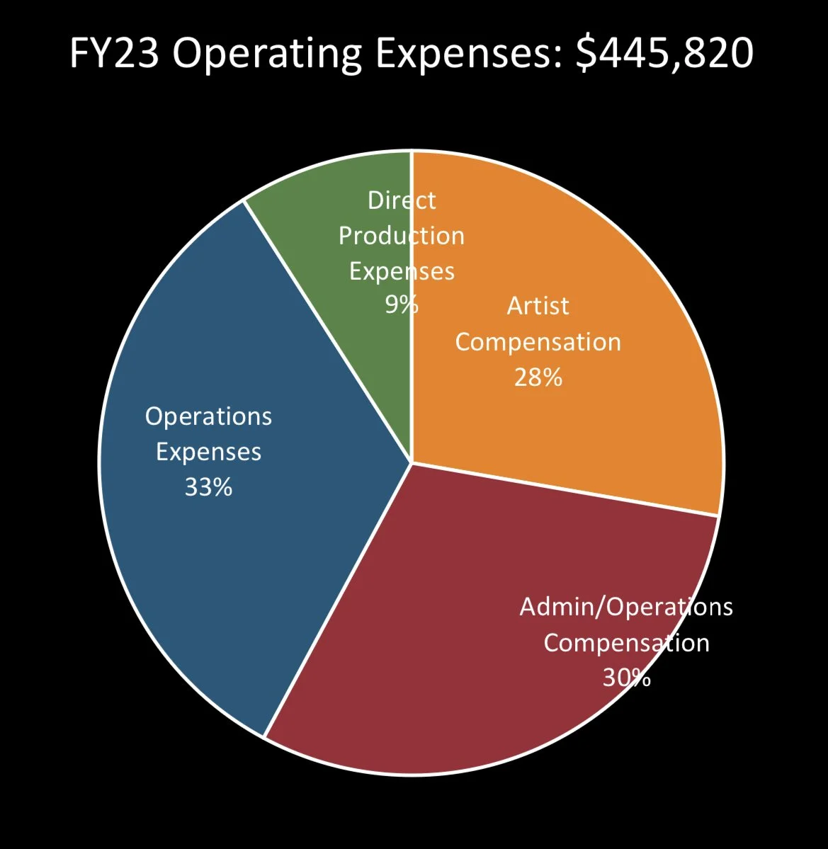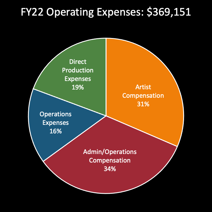 The following charts provide a breakdown of operating income and expenses for the past three fiscal years. Steep’s fiscal year runs September through August. Capital contributions and grants restricted for future years are not included in this report. The COVID-19 shutdown began half-way through FY20, and Steep left its venue on Berwyn Ave at the end of FY20 - both of these events had a significant impact on operating financials, which will continue to fluctuate as COVID Relief funding ends, Steep establishes its new home venue, and production resumes with a focus on equitable artist compensation.